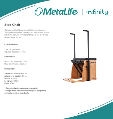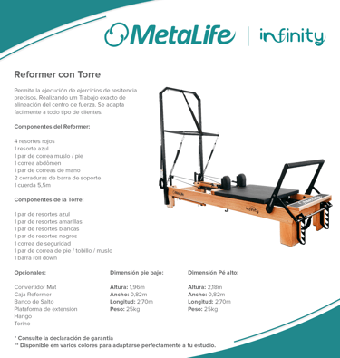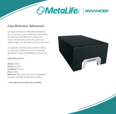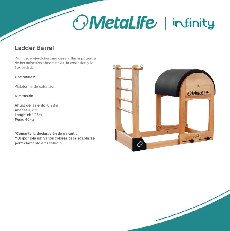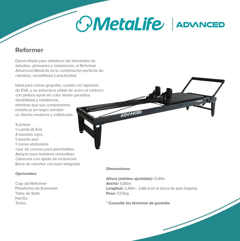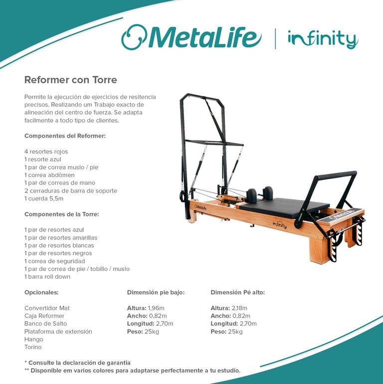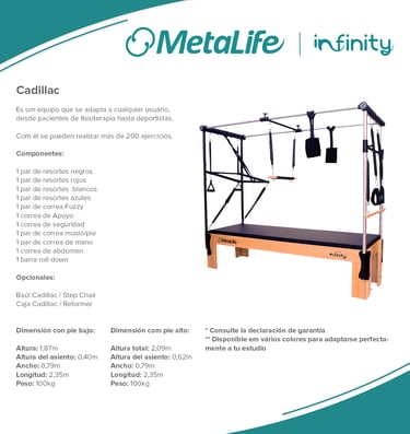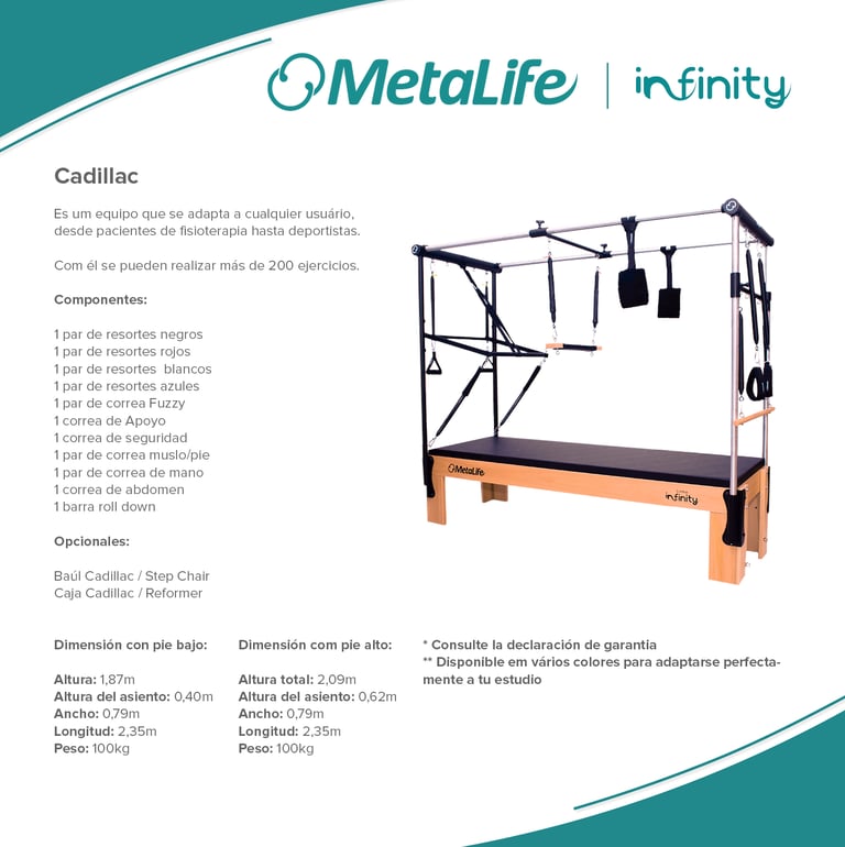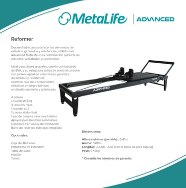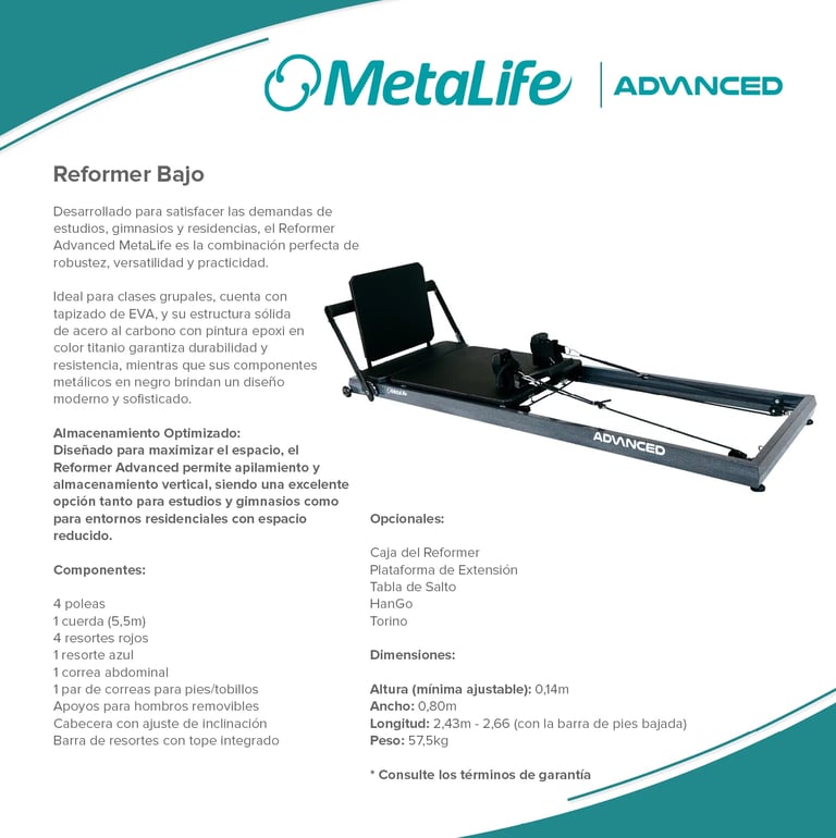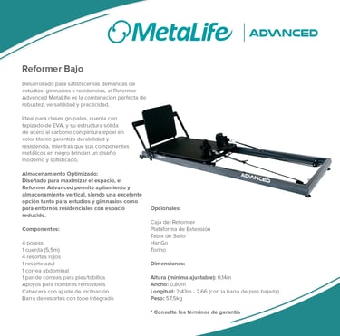 Metalife Pilates es sinónimo de innovación, calidad y durabilidad en el mundo del pilates. Sus equipos, diseñados con precisión y fabricados con materiales de alta resistencia, ofrecen una experiencia de entrenamiento segura, cómoda y adaptada a las necesidades de profesionales y practicantes. Con una estética moderna y funcional, los productos Metalife están pensados para optimizar el rendimiento, mejorar la biomecánica y garantizar la máxima fiabilidad en cada sesión.